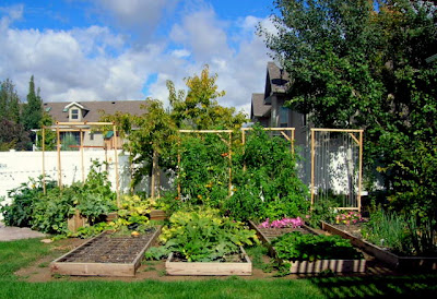 We will be moving the garden boxes in the spring, or depending on the weather, this fall. We will shorten the 3 boxes on the left to be only 2 feet wide instead of 3 so that we'll have enough room to walk in between them (and hop over them). The very best thing we did was to add a drip line for watering - in fact, I've only had a few tomatoes with split skins this year.